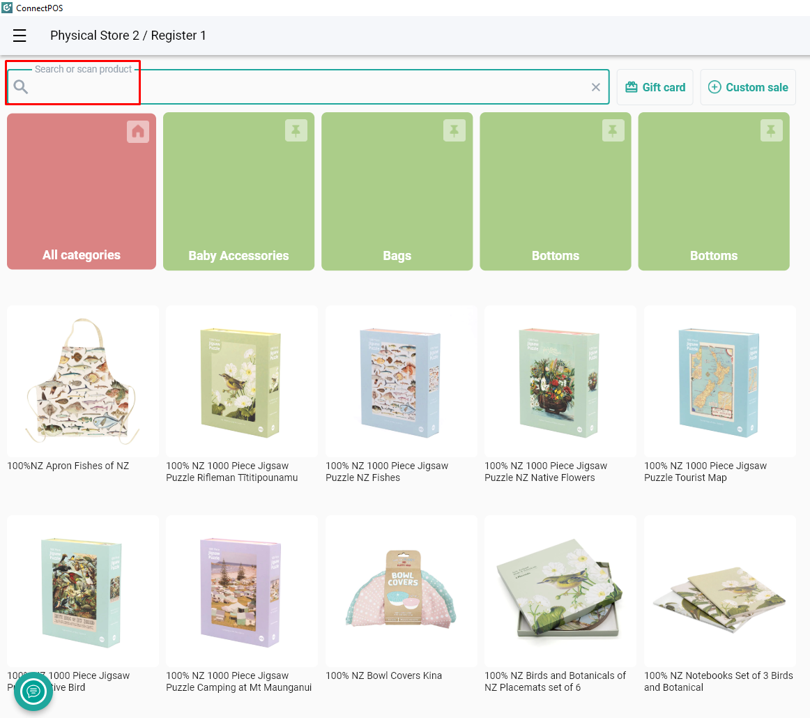 From the Sales Screen, click the Search bar > Enter the product name, SKU, or barcode number.