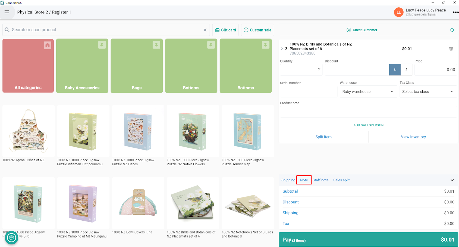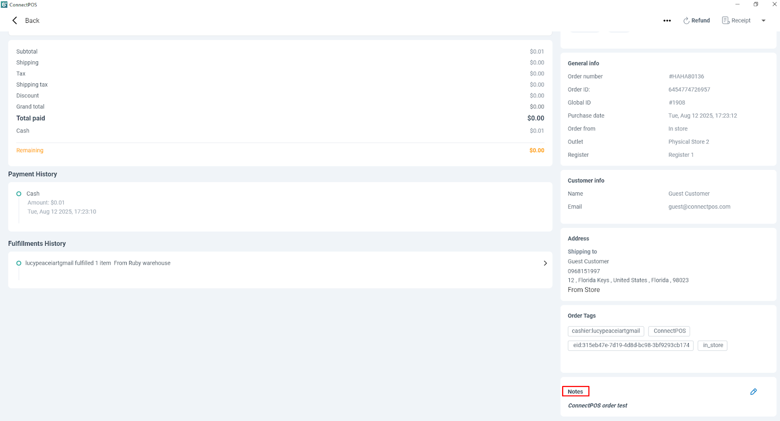 Once you add notes to the cart and complete the order, the note will appear on both the receipt and the order details.