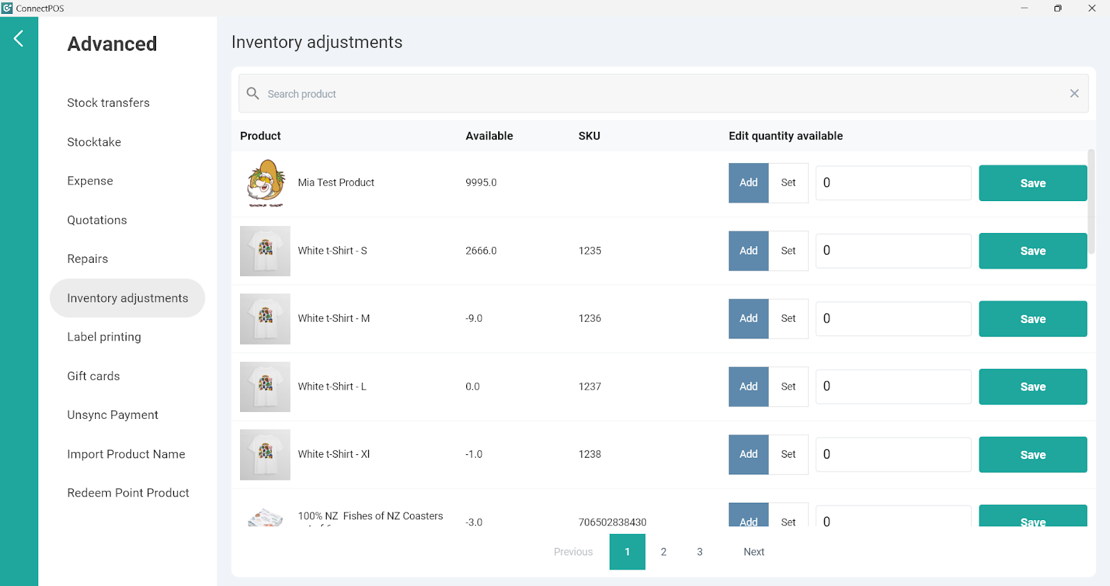 Step 1: Menu > Advanced > Inventory Adjustment > Enter new stock qty > Save