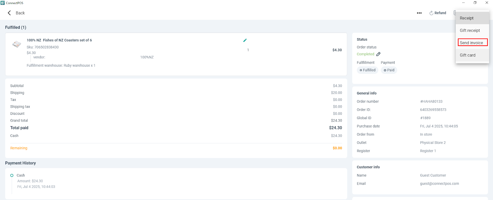 After setup, in case a customer needs to send invoices to your customer on occasion (not au-send), kindly search for the order in Order List > Receipt > Send Invoice > Enter email Send.